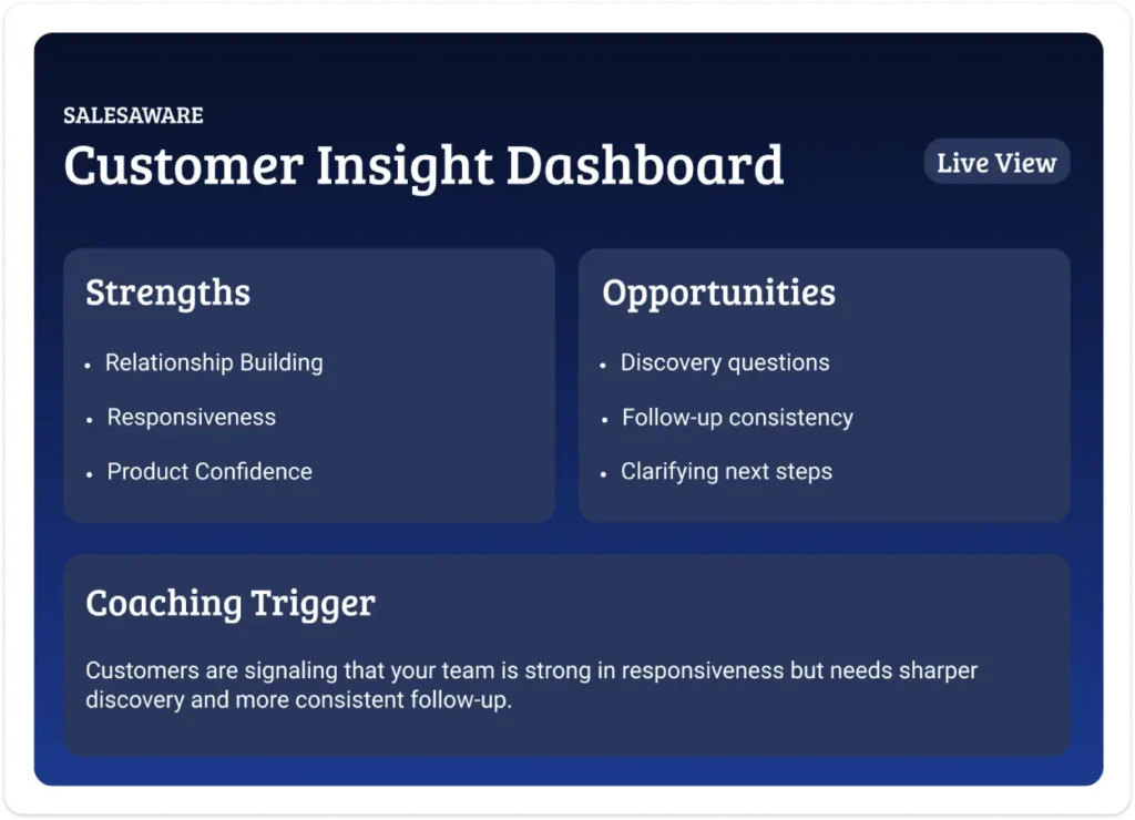 SalesAware helps organizations turn real customer feedback into coaching insights, actionable development plans, and stronger sales performance.